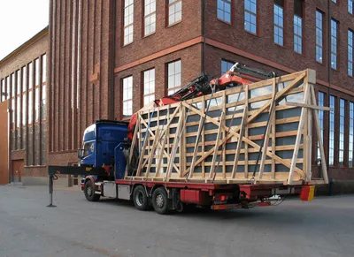 Используется манипулятор с грузоподъемностью 3-5 тонн. Этого достаточно для погрузки, перевозки и выгрузки различных модульных конструкций При этом услуги крана манипулятора обойдутся существенно дешевле, чем аренда специализированного транспортного средства для перевозки всей конструкции в собранном виде..
